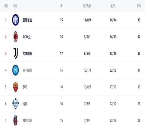 在积分榜上,国际米兰以33分高居榜首。不过,国际米兰的领先优势很少。AC米兰拿到32分,排第2,只落后1分。尤文图斯赢球之后,暂时升到第2名,也是32分。不过,尤文图斯踢了17场联赛,比米兰双雄都要多踢2场。那不勒斯总积分是31分,排名掉到第4。罗马以30分排名第5。前5的球队差距最多只有3分,冠军的争夺真是太激烈了。科莫以27分排名第6。博洛尼亚25分排名第7。