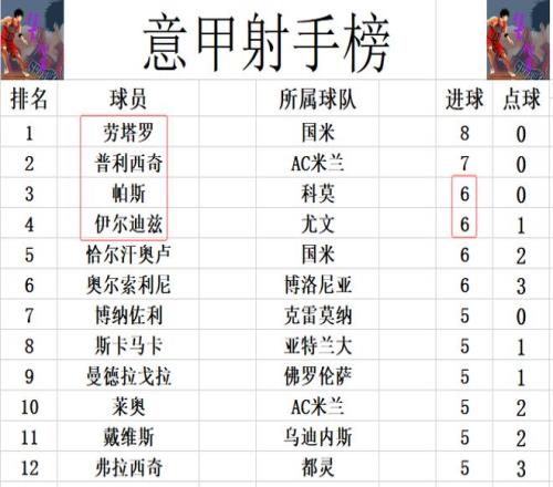 射手榜方面,意甲依然是五大联赛唯一无人进球上双的联赛,劳塔罗8球继续领跑,普利西奇7球位列第2。伊尔迪兹今天打入锁定胜局的一球,帕斯传射建功,他们追上恰尔汗奥卢和奥尔索利尼,4人6球并列第3。
