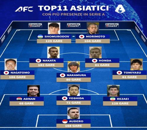 北京时间12月13日,德转列出了意甲联赛历史出场次数最多的亚洲球员11人阵容,长友佑都、中田英寿领衔,本田圭佑、